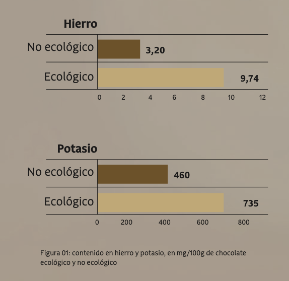 El potassi, per la seva banda, és crucial per a la prevenció de malalties cardiovasculars i la regulació de la pressió arterial. La xocolata ecològica conté un 83,75% més de potassi que la seva versió convencional. En aquest sentit, 100 grams de xocolata ecològica representen el 15,6% de la dosi diària recomanada de potassi, mentre que la no ecològica amb prou feines arriba al 8,5%.