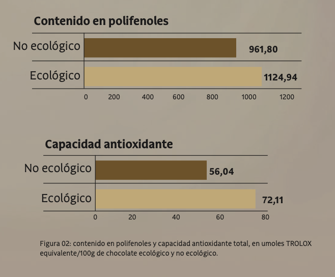 En comparar el contingut de polifenols entre la xocolata ecològica i la no ecològica, els resultats són clars. La xocolata ecològica, fins i tot amb un percentatge més baix de cacau, conté un nivell més alt de polifenols. Per exemple, 100 g de xocolata ecològica amb un 72% de cacau posseeixen 1.143 mg d’aquests compostos, la qual cosa representa un 19% més que la no ecològica. Aquesta mateixa tendència es mostra en els valors de la capacitat antioxidant total, que palesen una fracció antioxidant més gran en la xocolata de producció ecològica.