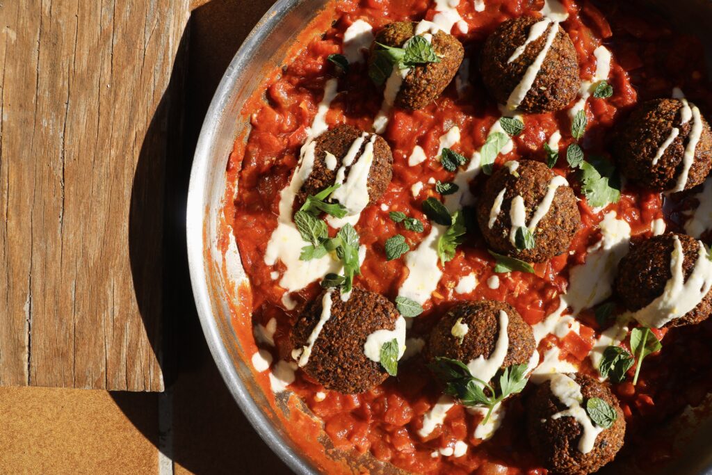 Quan la tardor s’instal·la, el cos demana plats càlids, especiats i plens de gust. Aquesta recepta combina dues elaboracions delicioses: falàfels verds farcits d’herbes fresques sobre una base de shakshuka casolana amb tomàquet, pebrot amb un toc spicy i una salsa de tahina que ho relliga tot.