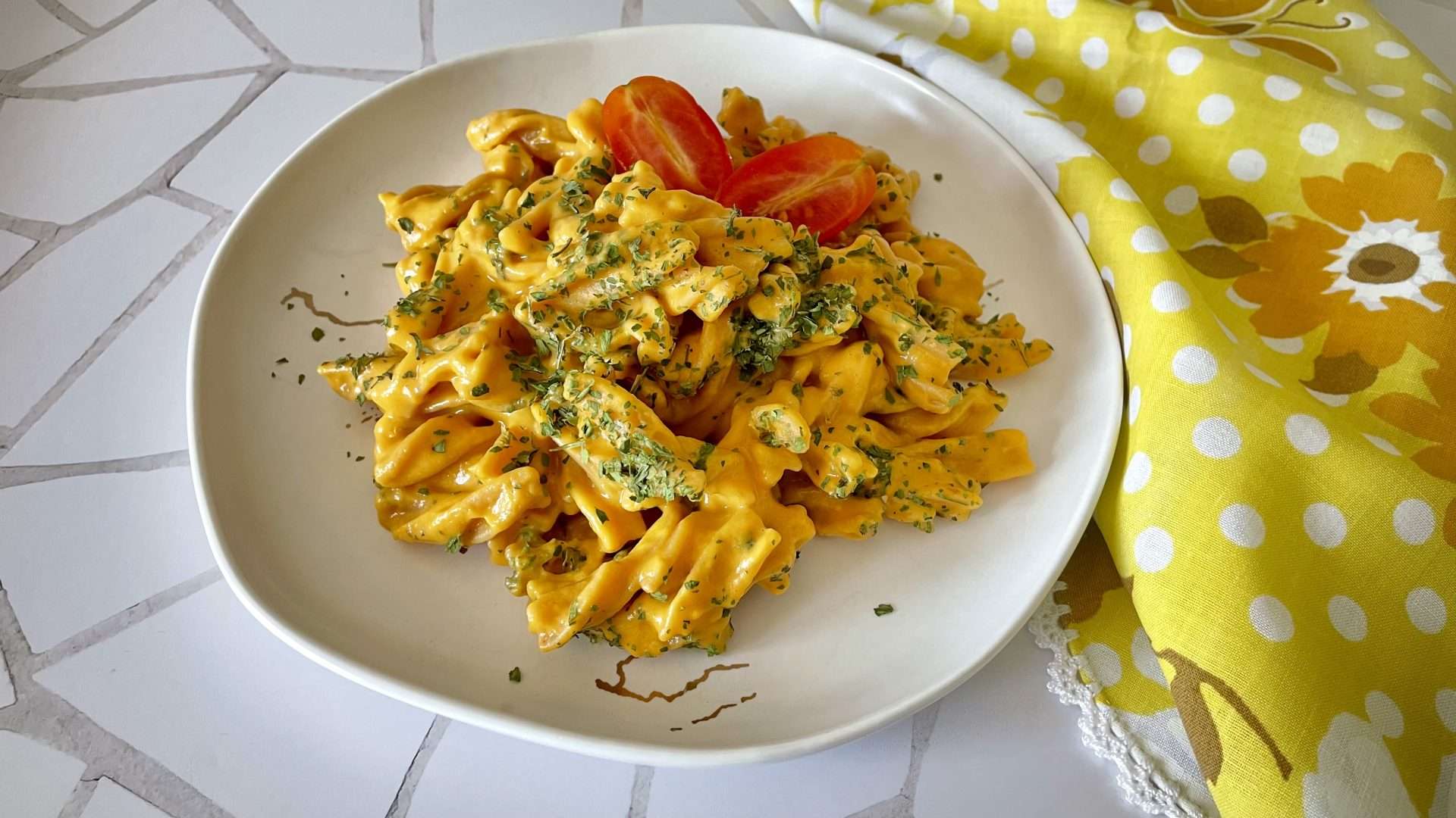 Ja és aquí la carbassa, aquesta hortalissa de color taronja que botànicament és una fruita. La seva polpa dura s’estova amb la cocció i queda suau i cremosa, ideal per donar cos a un guisat, un sofregit o una sopa. Aquesta vegada, podràs gaudir d’una recepta molt nutritiva i saciant gràcies a la pasta proteica de llegum, i molt agradable al paladar gràcies a la beixamel de carbassa.