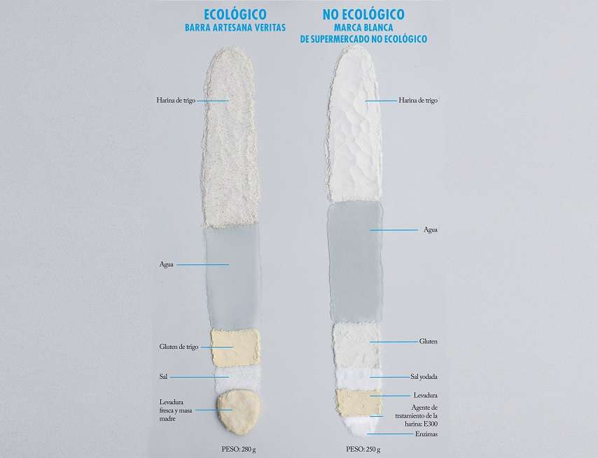 Una de las características de los productos ecológicos es la simplicidad de sus listas de ingredientes, que se reducen a la materia prima estrictamente necesaria. La barra Artesana únicamente se hace con harina ecológica de trigo, agua, sal y menos de un 0,5% de levadura. Sus calidades nutricionales, junto con su sabor, aroma y textura, son fruto de una meticulosa elaboración basada en un proceso lento que se alarga hasta 48 horas y durante el cual respetamos de manera absoluta la normativa ecológica.